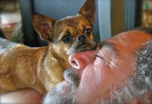 This is my husband Barry taking a Sunday afternoon cat-nap, with Alvin taking full advantage of the moment by taking his own “people-nap” . I have heard that people and their dogs begin to look alike in time, and I never really noticed their matching beards & mustache’s until I caught Alvin snoozing on the bridge of Barry’s nose.