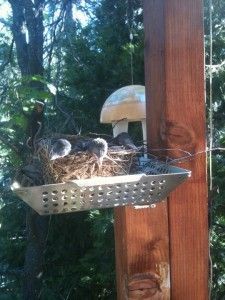 We saved these tiny Stellar Jays from a fate worse than death when construction forced us to move their nest – we took the chance that their parents would disown them. Fear not, after a racket of a search party on Friday, Mama and Papa found their young ones and were soon feeding them – amidst the clang of hammers and drills. The nest is within two feet of our outdoor dining area, everyone is quite happy with the arrangement! We think the Mama and Papa know that somehow they can totally trust us – but they take great precaution to make sure no other creature in the trees around us sees them go to the nest! Great parents and darling little ones!