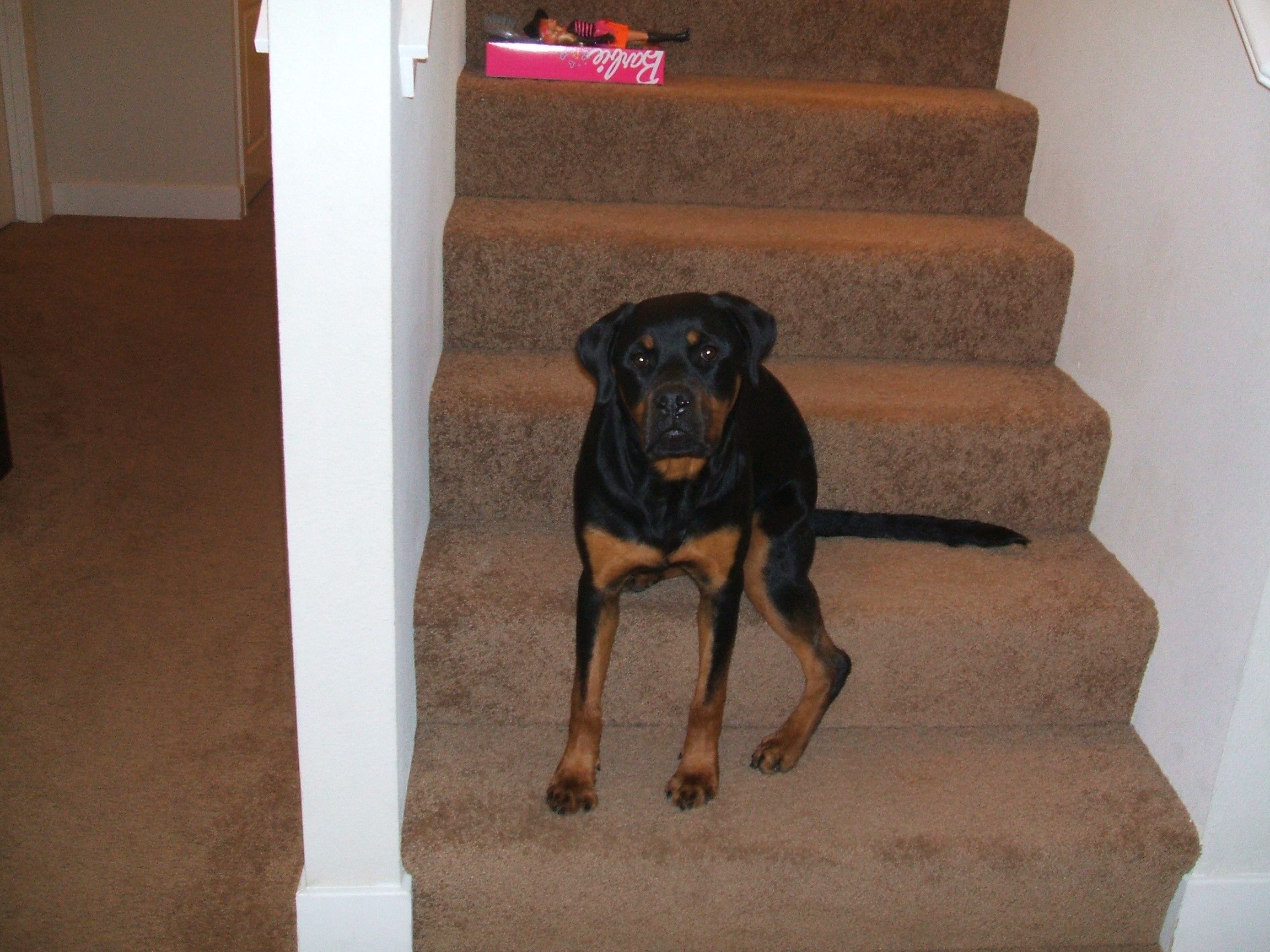 Our family is nominating our 8 month old Rottweiler puppy, Iris, for the KKBN Pet of the Week Award. Iris is a smart puppy with a sense of humor. She likes to sit on the stairs. She is only allowed on the first stair, but you can see sometimes she gets sneaky. Iris also likes to do somersaults and chase her tail. She is gentle with children, and really wants to befriend our 10 year old cat Lilly. She smiles when she is happy. We are head over paws in love with her, and hope you enjoy the photos.