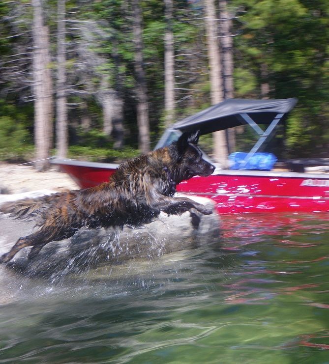 She is obsessed with tennis balls. There isn’t a place she goes without one in her mouth, hoping to awe some sucker into playing fetch. She will run miles and leap off rocks, never tiring to fetch her catch (such as she is pictured here at Cherry Lake in June, 2011.)