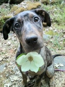 I fell in love with him at the Tuolumne County Humane Society, in late March this year. He just turned 4 months and is a loving handful. I keep him busy with hikes laden with obstacles as he needs puzzles and challenges to keep him busy. He is tack sharp and loves to please…he is learning a new trick every week! His breeding is unknown, but from what I can tell and what others observe, he must be a Catahoula Cur. Whatever his breed, he is a purebred supersnuggler and my little dappled shadow who follows me wherever I go.