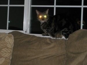 Here is a photo of our cat Herkeleez for entry for Pet of the Week.  The reflection of the flash in the Herk’s eye make for a “Halloween Kitty”.