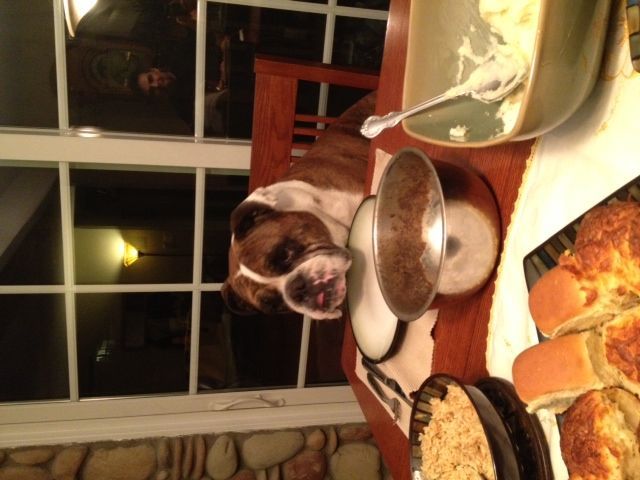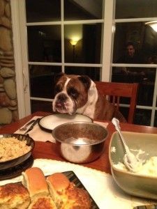 This is my grandson-dog Bandit.  Bandit is a 5 year old English Bulldog.  He is waiting patiently for his Thanksgiving dinner to be served.