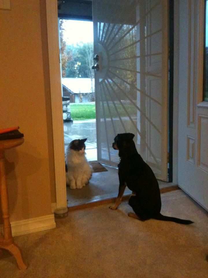 The stand off! Meow-meow wants in from the rain and “stinker” (and yes she lives up to her name) wants to know the password.