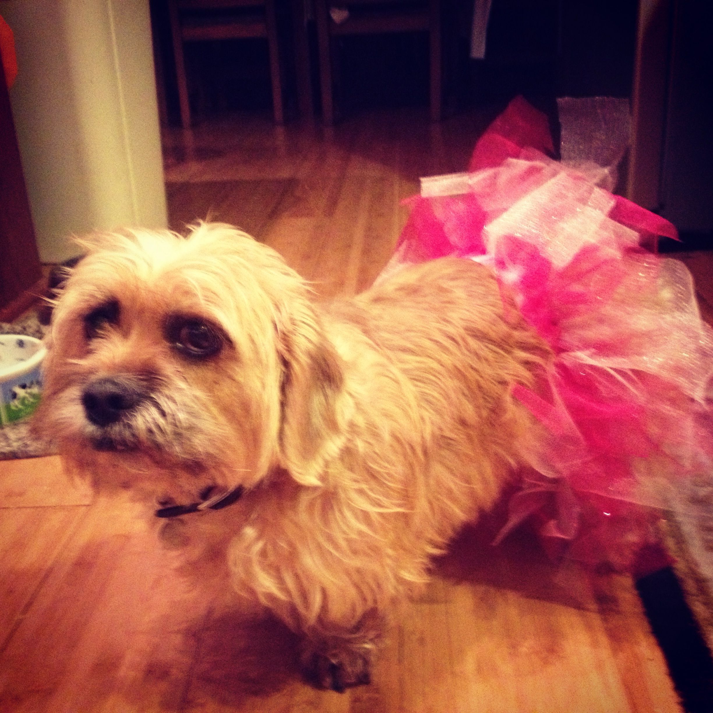 I would like to nominate my dog Siddalee for the Pet of the Week award! She is a three year old Shweenie (half Dachshund and half Shih Tzu) and I love her to death!  Since this Tuesday is National Dress Up Your Pet Day, here she is modeling one of the two tutus that I made for a baby shower. Since there weren’t babies around to test the fit, I chose her. Clearly, pink is her color. 🙂
