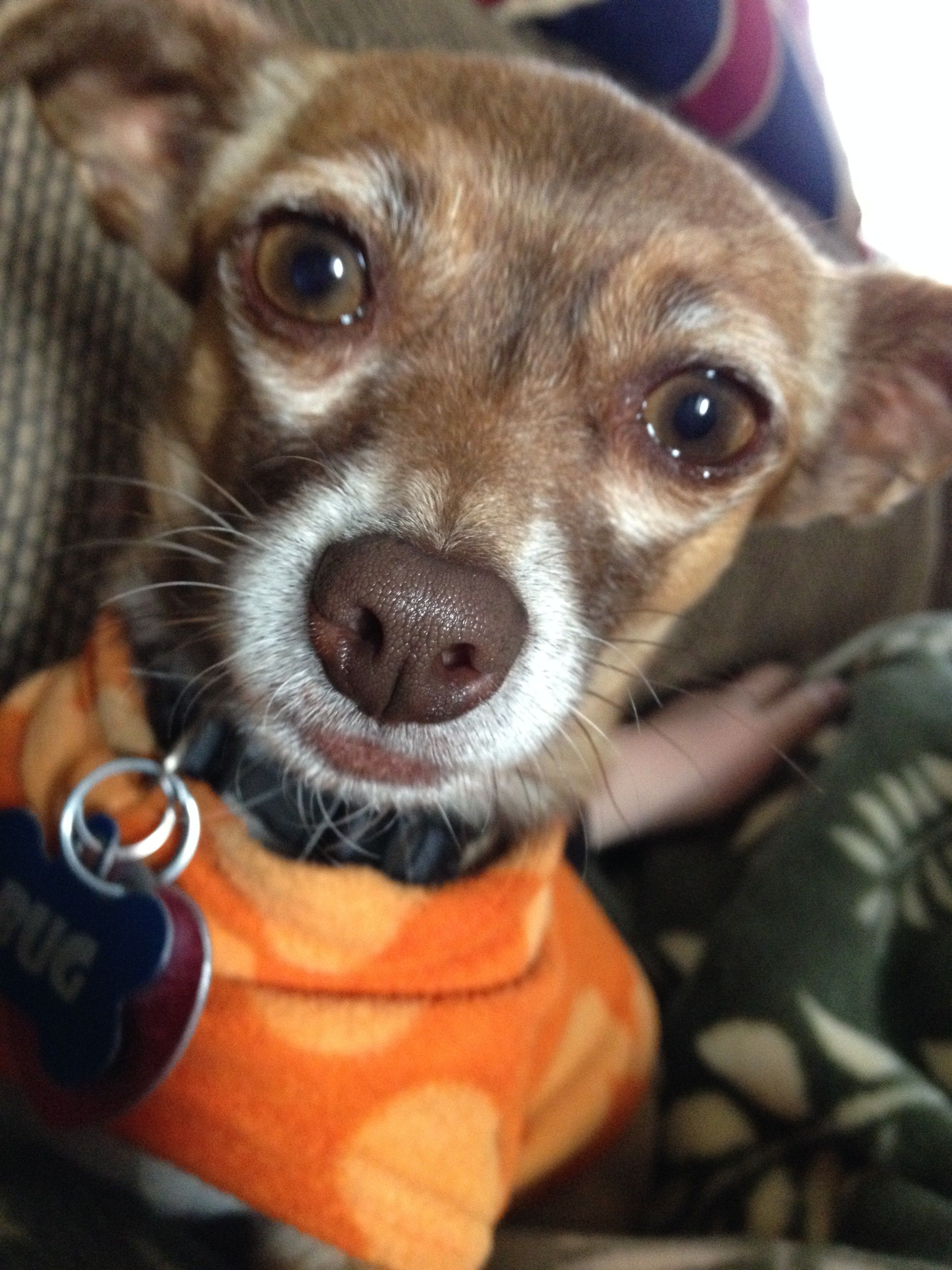 Here’s a little background of our relationship: We found Bug running around the streets, abandoned, almost 3 years ago. He came right to me when we called him. We named him Bug because of his big, expressive eyes and he was “cute as a bug”. He has been the best pup anyone could ask for! This weekend he recently had a seizure and we can’t imagine if anything was to ever happen to him! We love our Bug!