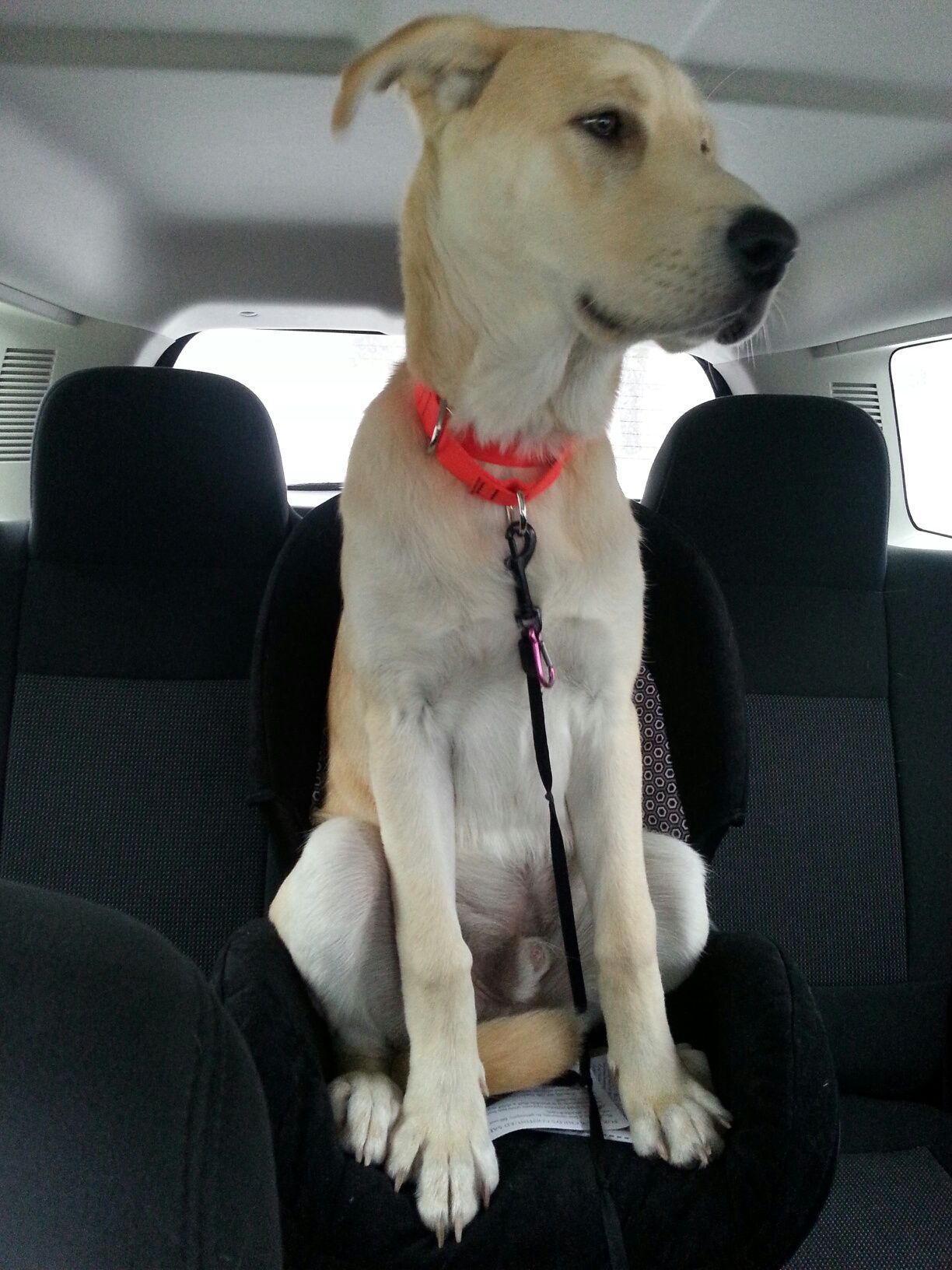 This is my dog Myken. He is a husky lab mix, and he will be a year old in June. He loves to take rides while sitting in my niece’s car seat! 🙂