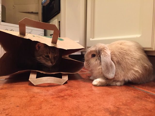 This is Sunflower, the cat. She was adopted from the Calaveras Humane Society about a year and a half ago. She’s playing with our 3 month old Holland Lop, Fluffy. Don’t worry, they are always closely supervised!