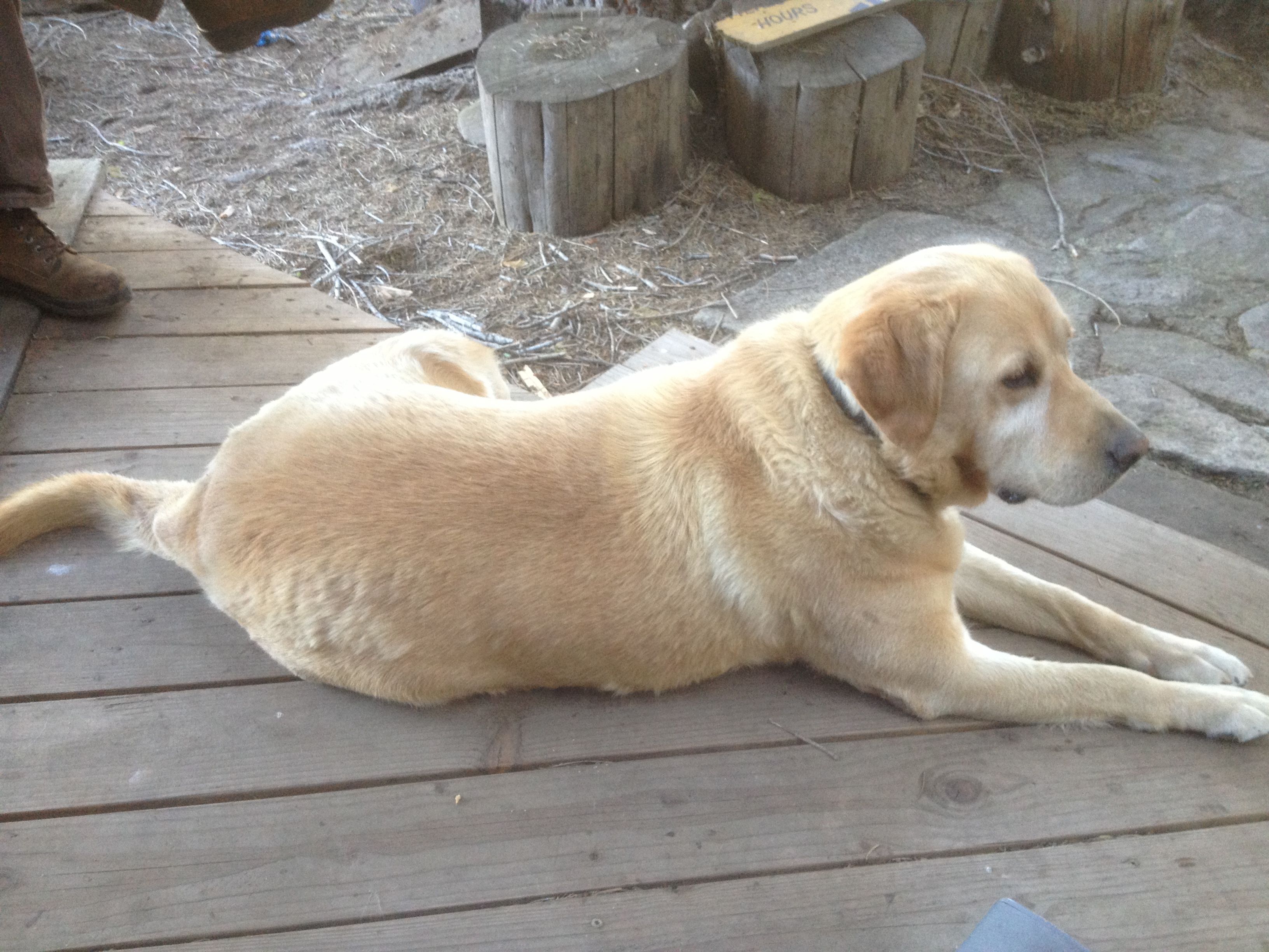 His name is Jake, an 8 year old yellow lab, that has been through quite a bit in the last few months. He turned 8 on May 1st and on the following Saturday we noticed that he wasn’t quite right. Researching we discovered that he was paralyzed from the neck down. Not sure what to do with him we took him to our local vet who indicated that there was nothing they could do for him but gave us a contact number for a wonderful vet in Stockton. Making the trek to Stockton and a week later, surgery was performed on two damaged vertebrae near his skull. Through dedicated daily exercises and about 4 weeks later, he was up and walking on his own. Today he is back to his normal self. A fun loving, energetic 8 year whom we dearly love. He is a very important part of our family.