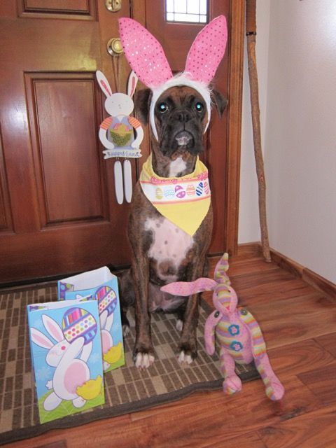I would like to nominate my 14 month old boxer, Dolce, for Pet of the Week. She is wearing her Easter Bonnet and much to her dismay, she could not eat what was in those bags! Dolce is currently asking the Easter Bunny for a normal mom who does not dress her up for the holidays! She is a daddy’s girl and the light of our lives! Happy Easter to all!