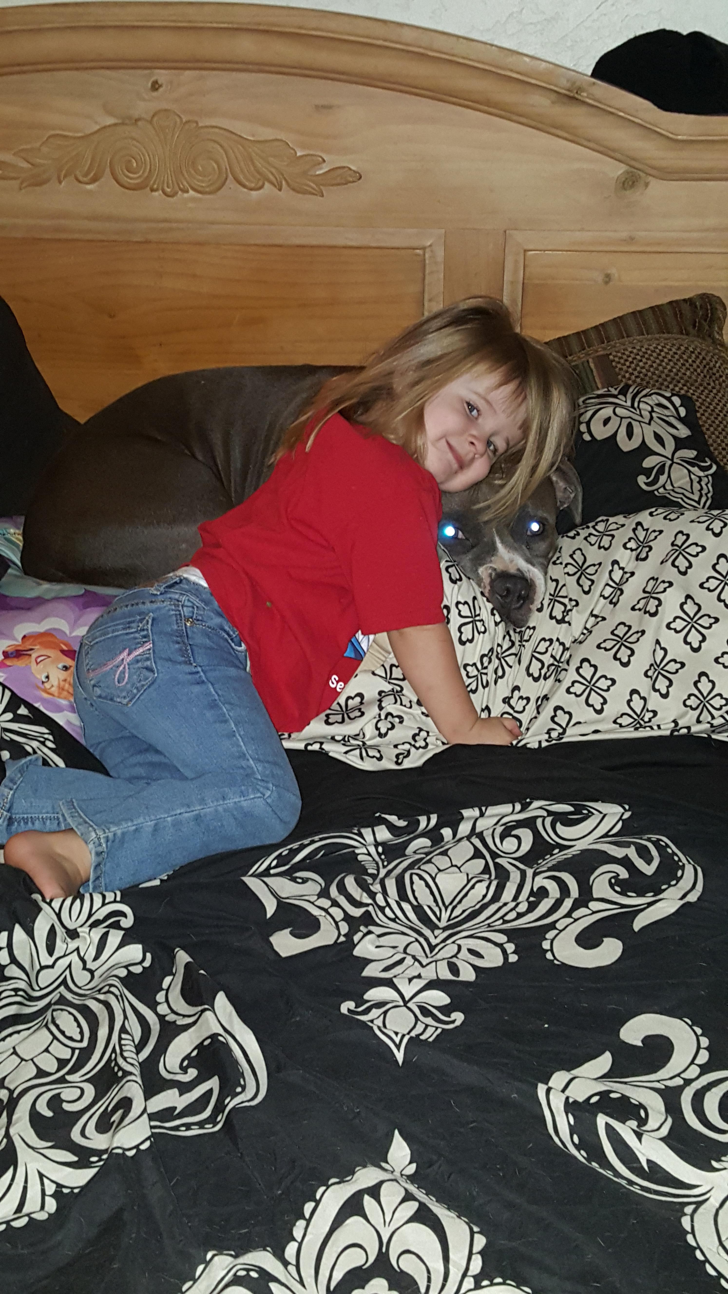 This is Michele and her dog bo they are best friends she walks him and feeds him potatoes the best part of his day is laying on the bed and snuggling with his girl as they watch movies. It’s hilarious to watch a 30 pound girl walking an 80 pound dog down the driveway but he is very gentle. These two are best friends for ever.