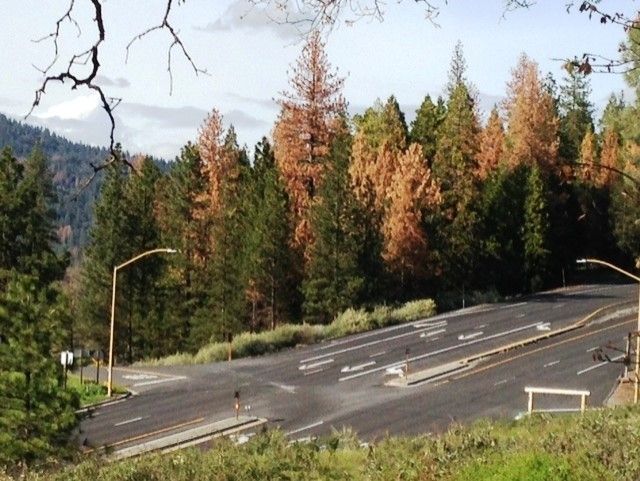 While it is tough to see the rising numbers of our drought-stressed pines under attack by bark beetles, positive progress is beginning to be made. June Woodard of Twain Harte shares a couple of telling pics taken March 27 and June 14, 2016 — before and after abatement efforts — near the entrance.