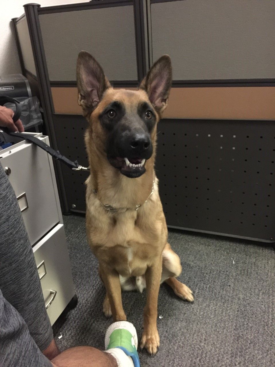 My name is Kyle Ferrell and my dogs name is Grunt.  Named after the marine corps infantry. He is my service dog for PTSD. In this picture he was visiting the Tuolumne county sheriffs dispatchers. A real hard worker.