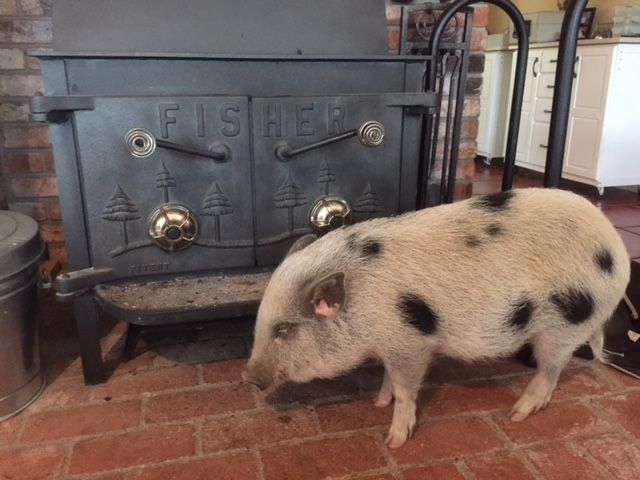 Meet Abby. She is a 9 month old Juliana pig. We are her 4th home, so she has some trust issues. We have only had Abby for a little over a month. We refuse to give up on her. She can be challenging but she is also funny, sweet and entertaining. Her favorite things include swimming in the kiddy pool when its hot, snuggling in her blankets when it is cold and of course, she loves a good fire by the wood stove.