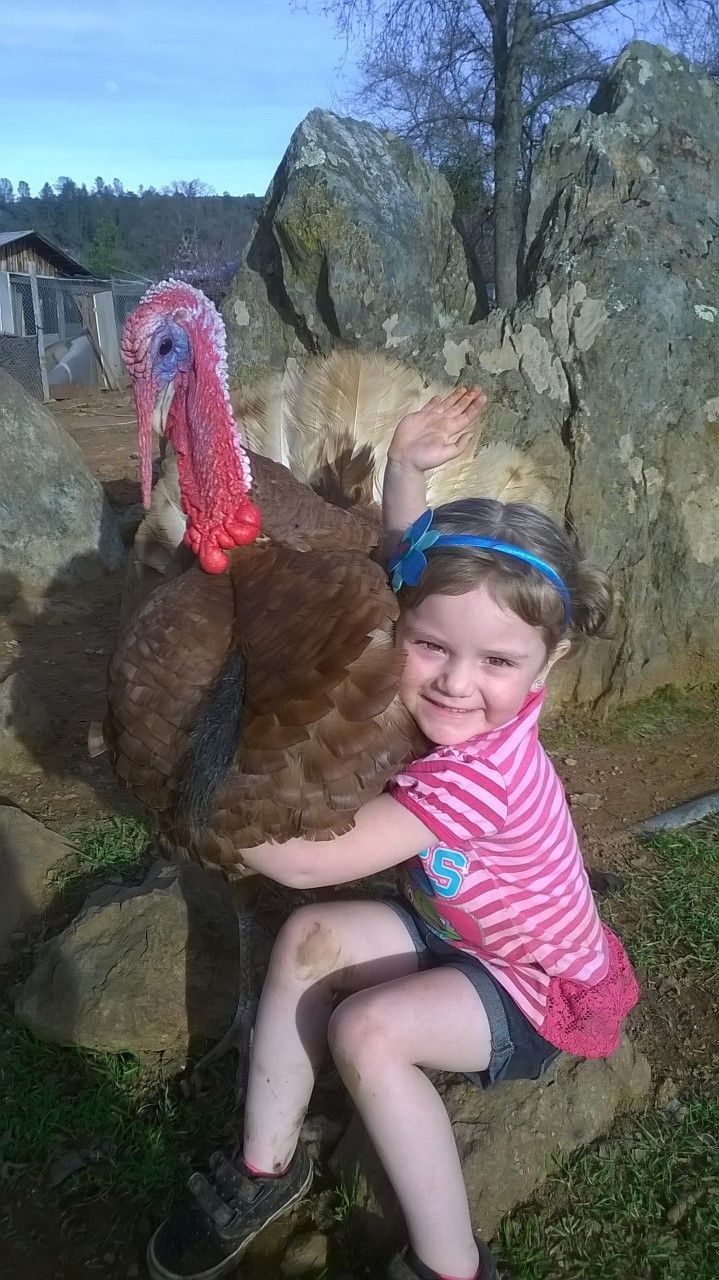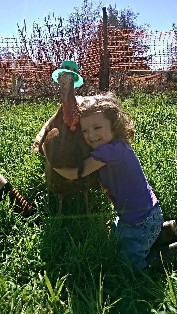 This is Kenny the Turkey with his best pal Gemma. Kenny enjoys following Gemma wherever she goes. They have picnics and dress up parties. When Gemma sits in the grass, he climbs in her lap and nuzzles her for hugs. We’re so glad we never went through with our original Thanksgiving plans. Kenny has found his forever home, and has given us many reasons to be thankful.