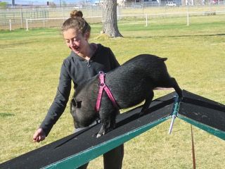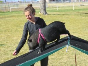 Emily the pig doing dog agility!  Also, being a therapy pig and visiting nursing homes and schools.
