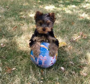This is my 8 month old Yorkie (Buster). Buster loves to play ball and will even use his nose to push the ball around the yard like a soccer player.