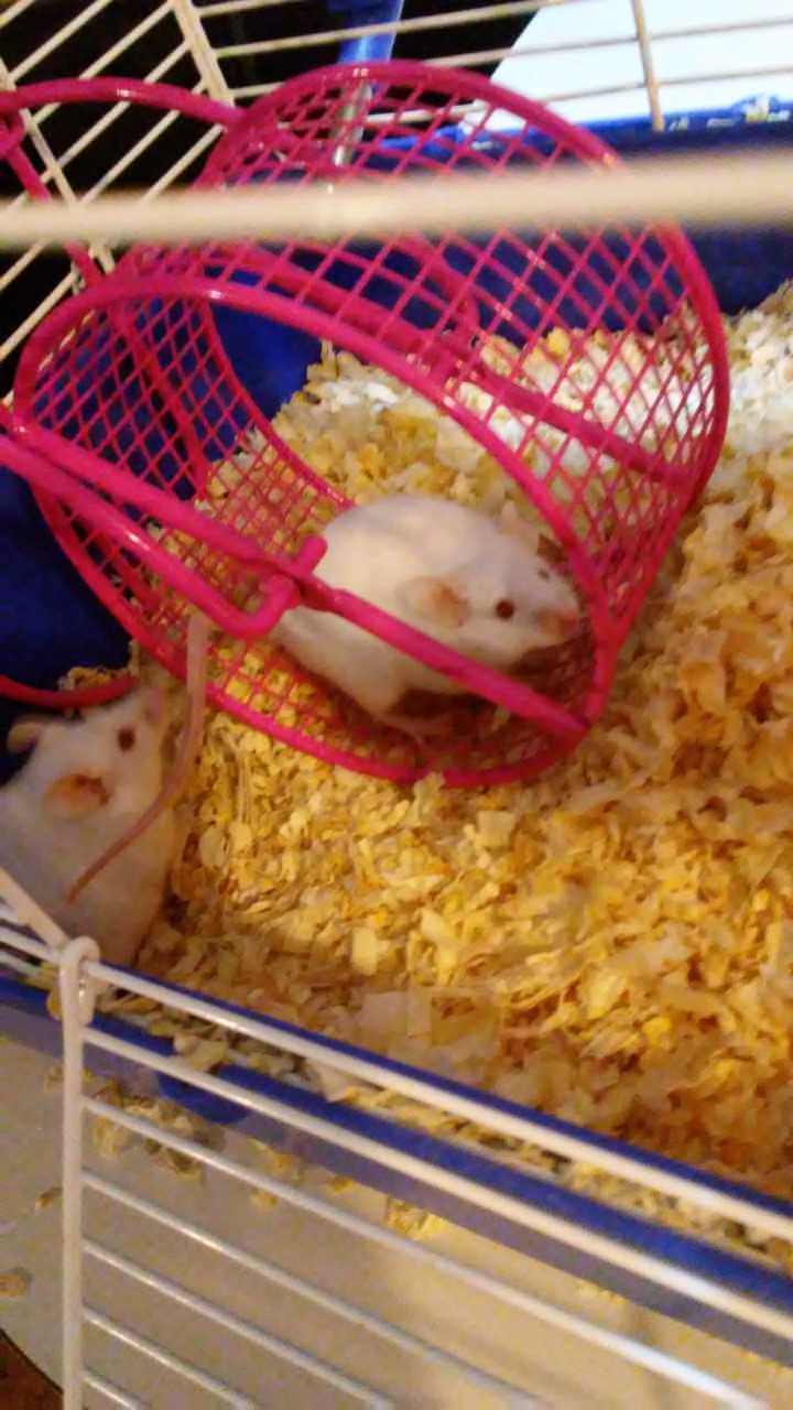 These are my sons pet mice named rainbow 1 and Rainbow 2. They love running on their wheel and my son thinks it’s hilarious when they both run on it.