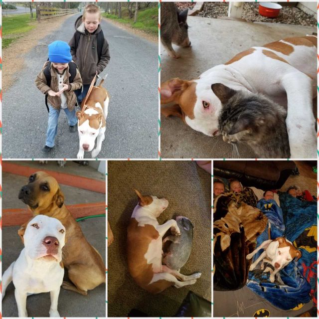 Baby is a pit bull mix but is the sweetest baby ever! She loves all animals and is amazing with our kids!