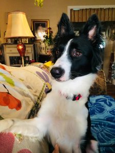 Here is a picture of my classy Border Collie, Maya.  We love her silly playful self!  She is a year old and extremely energetic.  She enjoys eating veggies over dog food and herding our bunnies and chickens that wander into our house from the yard.