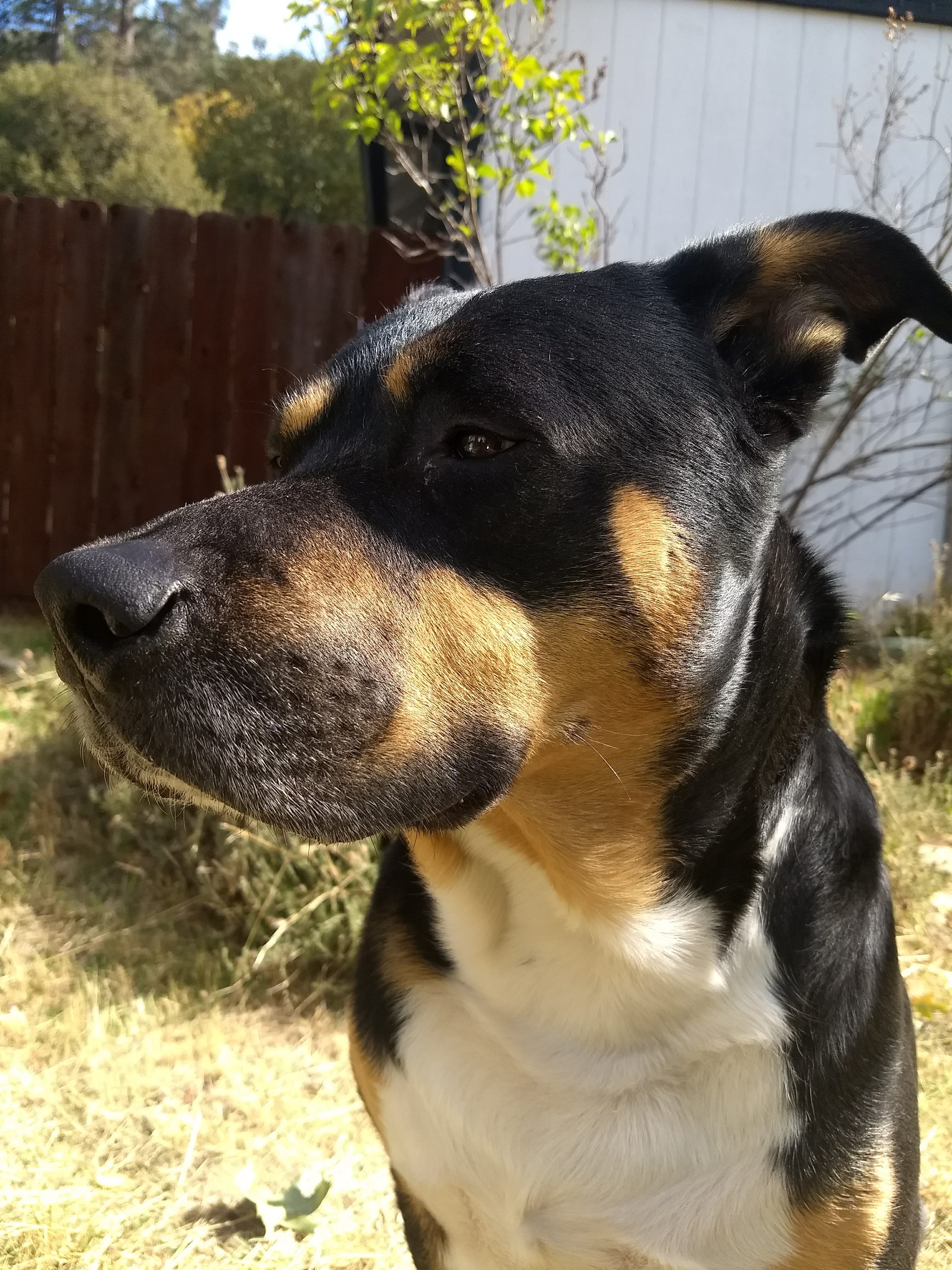 Kujo is an 8-year-old Pitbull mix. Kujo overall has always been the more laid-back type preferring to lounge around and chew on sticks instead of fetching them.