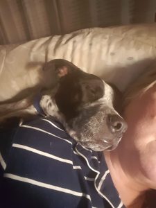 He is so lovable and enjoys hunting videos. He watches them on tv with my husband for hours.