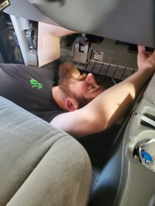 He commutes 3 days a week where he’s an Auto mechanic, and 3 days as a self-employed mechanic. When he’s not doing mechanic work, he does body and paint work with his dad. We also just started our mobile pizza business and have been scheduling events on the little bit of spare time he has.