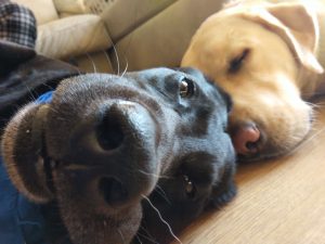 Hi, I’m Cadence and these are my dogs Sadie and Oso. They are Labrador retrievers and Sadie loves to go hunting. Sadie is around 75 lbs and Oso is about 96 lbs. Sadie is Oso’s mother and they both love to play and nap together.