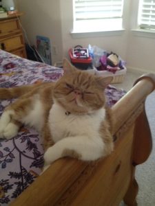 This is Sunrise. He is a rare breed cat called an Exotic Short Hair.  He is 13 years old and is adored by many. Although he has a grumpy face, he is the sweetest cat and his personality is hilarious.  He loves to play fetch all day long, and when he is not playing, he loves to listen to music and dance with me in the kitchen, especially to Harry Styles.