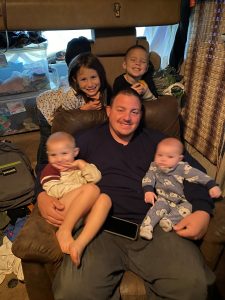 Here is Lynn with all our kids taking a break from his truck schooling helping with the baby. He started truck school December.
