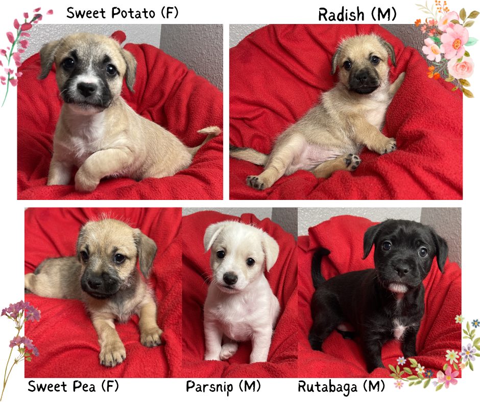 These cutie patooties were born on January 23rd, 2024. Their mother is a small Terrier mix, but we suspect their dad was a larger breed. These puppies are expected to be medium sized, and are so much fun! They love to play, are very social, and will take on the day with vigor. Come meet them for yourself!