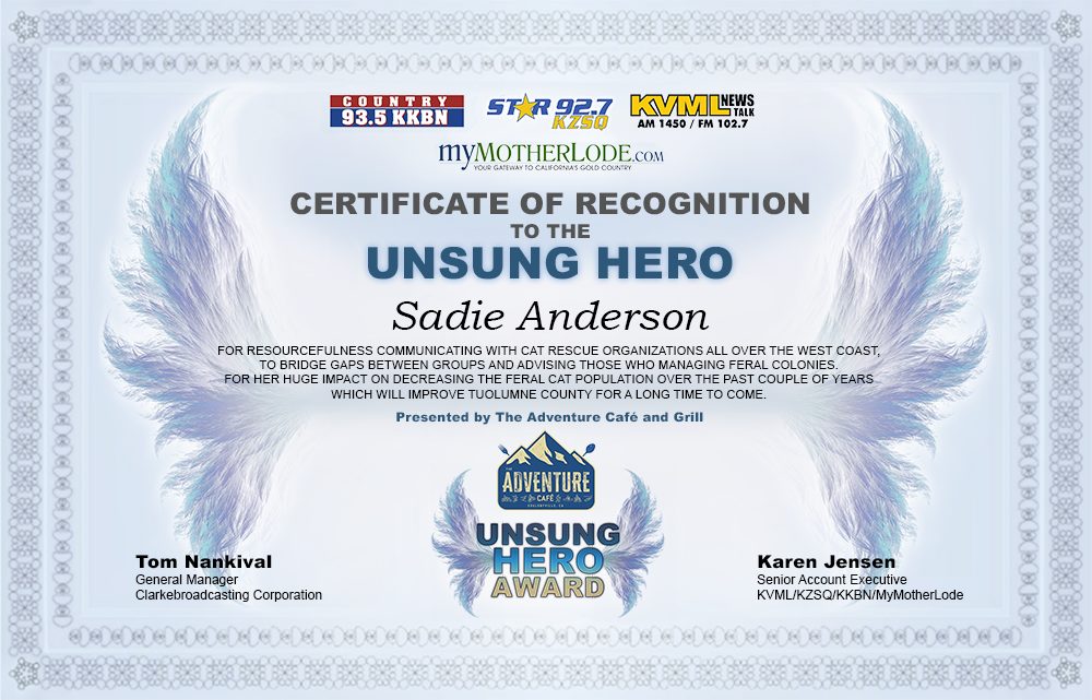 Sadie has taken a special interest in the feral cat problem in Tuolumne County. She has used her resourceful ness to communicate with cat rescue organizations all over the West Coast, and has helped to bridge gaps between other groups, often giving advice to those who are trying to manage feral colonies. She has had a huge impact on decreasing the feral cat population over the past couple of years, which will improve Tuolumne County for a long time to come. Sadie truly exemplifies an Unsung Hero.