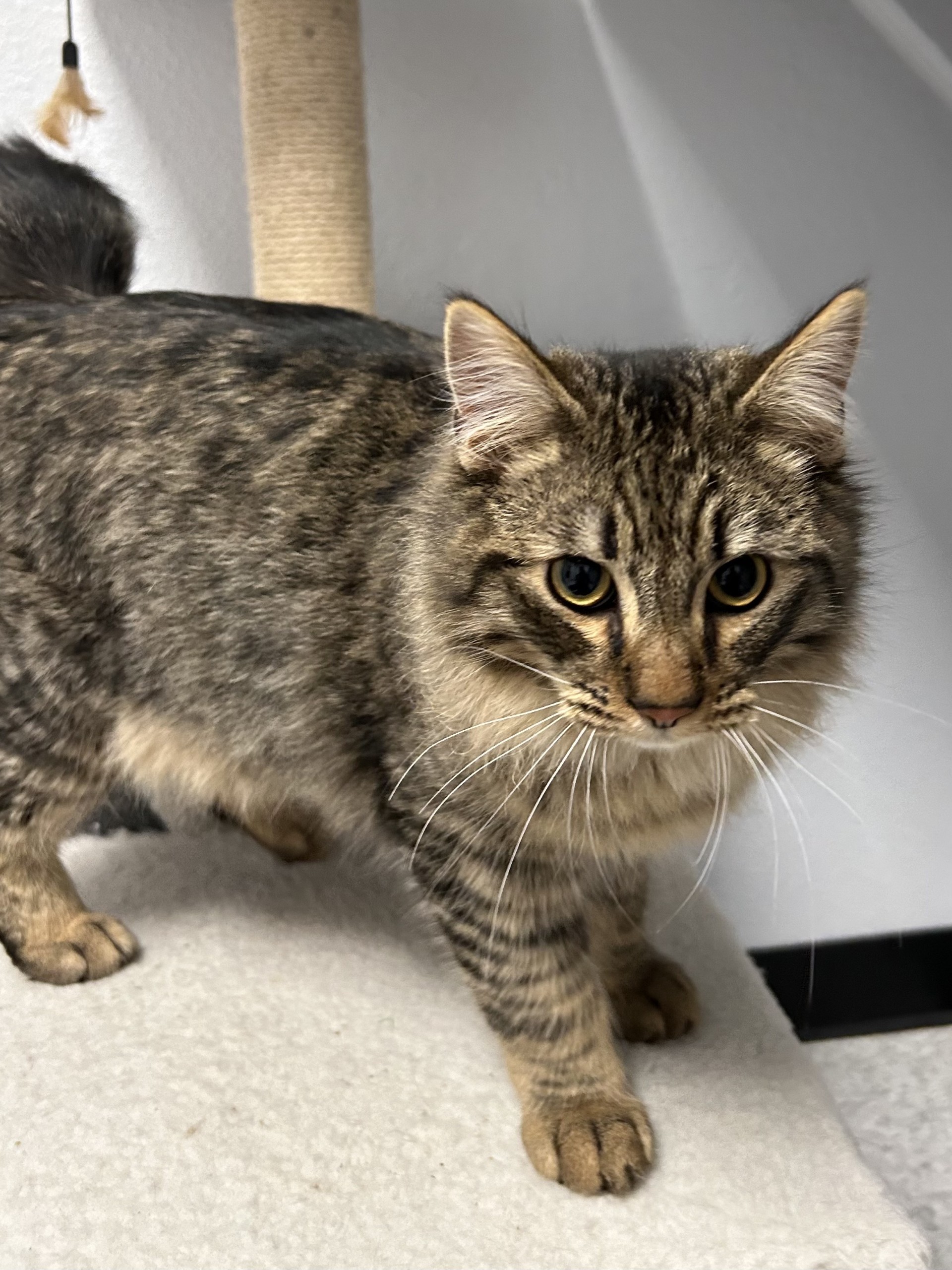 Dean: 7 months old, Male, Longhair Tabby Dean is a gorgeous boy who may look “large and in charge” but prefers to take life at a slower pace and play on the quieter side of the lobby. Despite being a wallflower, he enjoys pets and will quickly be your friend with sweet talk and loves. So far he is doing well with the other cats and mostly sticks to himself. Come by the shelter today and spend time with this beauty!