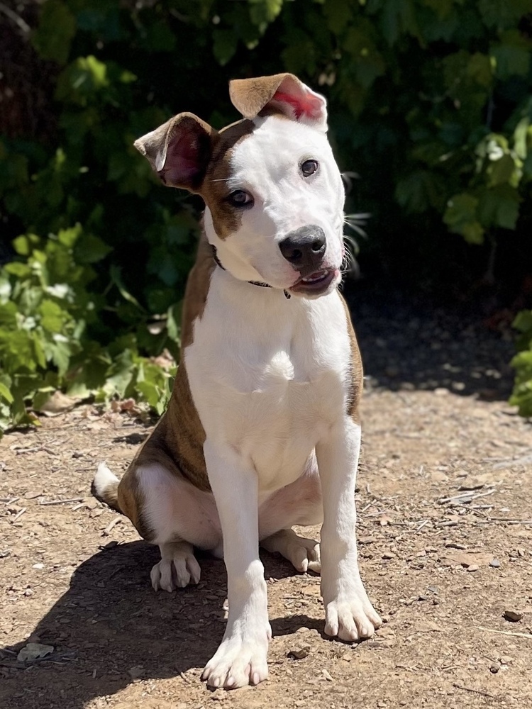 Rowan: 6 months old, Male, Pit Bull Terrier mix, 45 pounds Rowan is a happy-go-lucky pup and always up for an adventure, Rowan is the kind of dog who brings a smile wherever he goes. He gets along great with his other dog friends and would love a home where he can have a canine buddy or two to romp around with. Whether it’s hikes, games of fetch, or just goofing around in the yard, Rowan is ready to be your adventure partner and best friend. If you’re looking for a joyful spirit to brighten your days, Rowan might just be your perfect match!