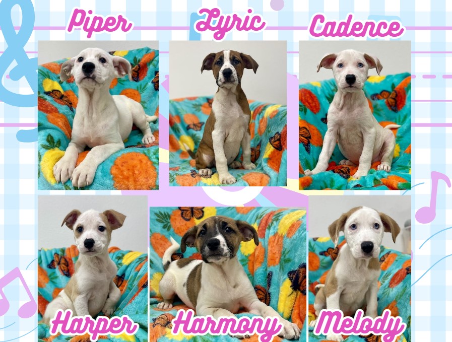 Music Litter: 2 months old, All Females, Medium-large size full grown Bring home blue-eyed Cadence or Melody, petite-and-sweet Harper, snuggly Harmony, silly Piper, or big-and-bold Lyric. Each one is perfectly unique in both appearance and personality. This little crew of musically themed puppies (all females!) are poised to strike the right chord with someone ready for a touch of puppy chaos—plus all the joy and exuberant fun of adding a young dog to their family. If that sounds like you, come down to the shelter for a meet-and-greet!
