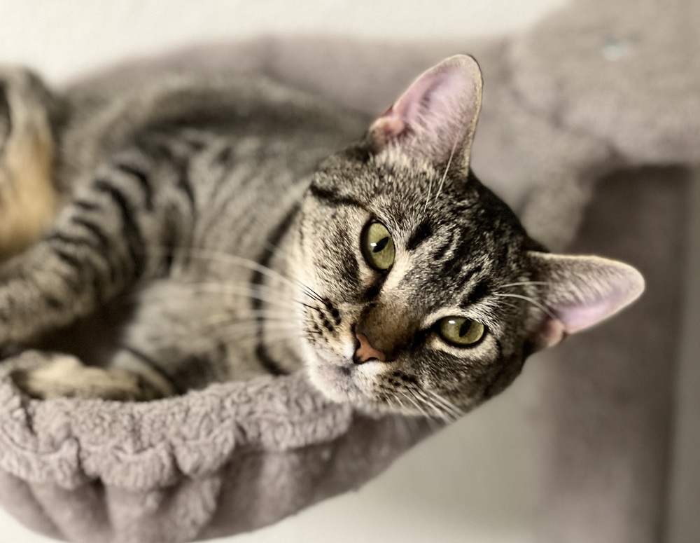 Scout is very sweet and affectionate, and we can picture her snuggling on the couch with her new people. She hasn’t been overly adventurous since she’s been with us, but she does enjoy her cat condo where she can watch the shelter happenings and say hello to visitors. Scout would be a great choice for someone looking for a lower-maintenance friend that still enjoys pets and affection.
