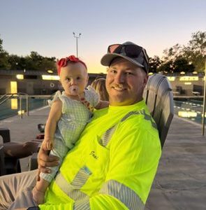 Josh works full-time for the City of Dixon in pool maintenance and management, and he takes so much pride in his work. He keeps the pools looking pristine and is constantly getting great feedback because he truly cares about doing a good job. He starts his days early, working from 6:00 AM to 3:30 PM, and after a full day he still comes home ready to be a dad and a husband.