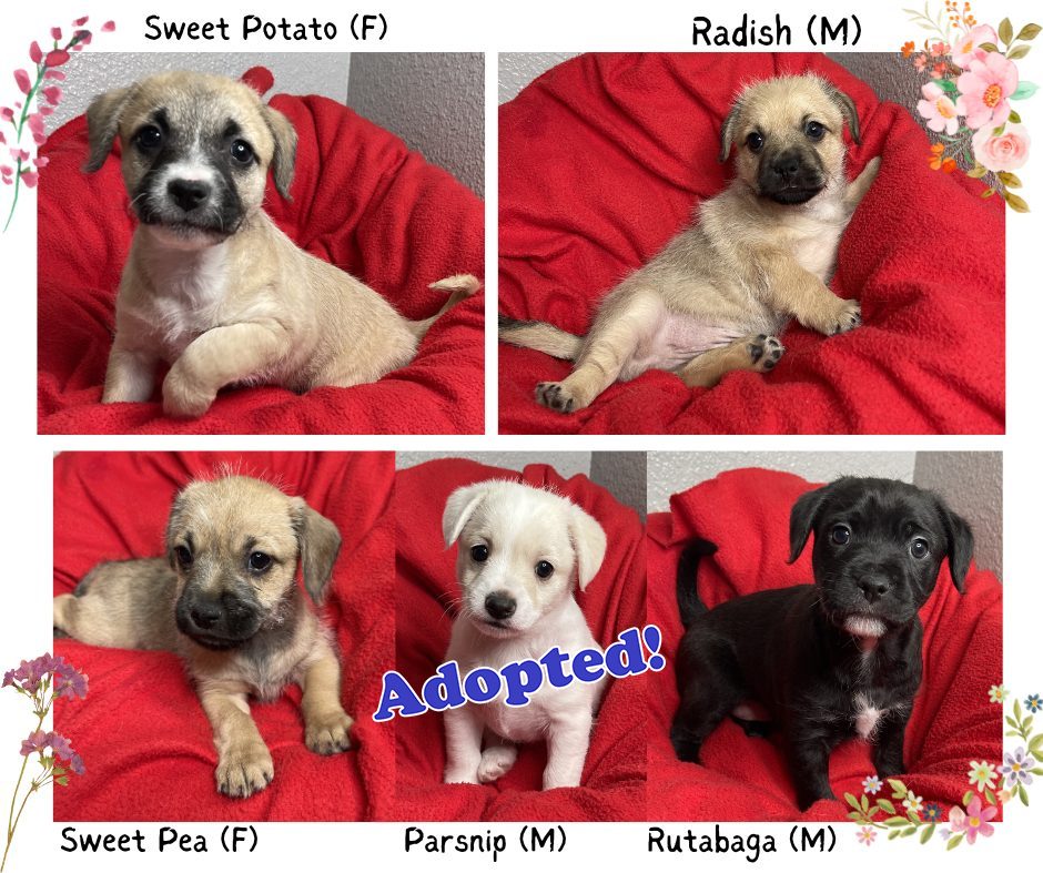 These cutie patooties were born on January 23rd, 2024. Their mother is a small Terrier mix, but we suspect their dad was a larger breed. These puppies are expected to be medium sized, and are so much fun! They love to play, are very social, and will take on the day with vigor. Come meet them for yourself!