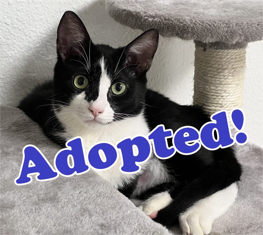 Asher: 5 month old, Male, Shorthair Tuxedo Little guy Asher loves playing with his kitten friends and relaxing on cat trees. He can be a bit of a wallflower with people at first, but give him some time, and he’ll be climbing in your lap to say hello.