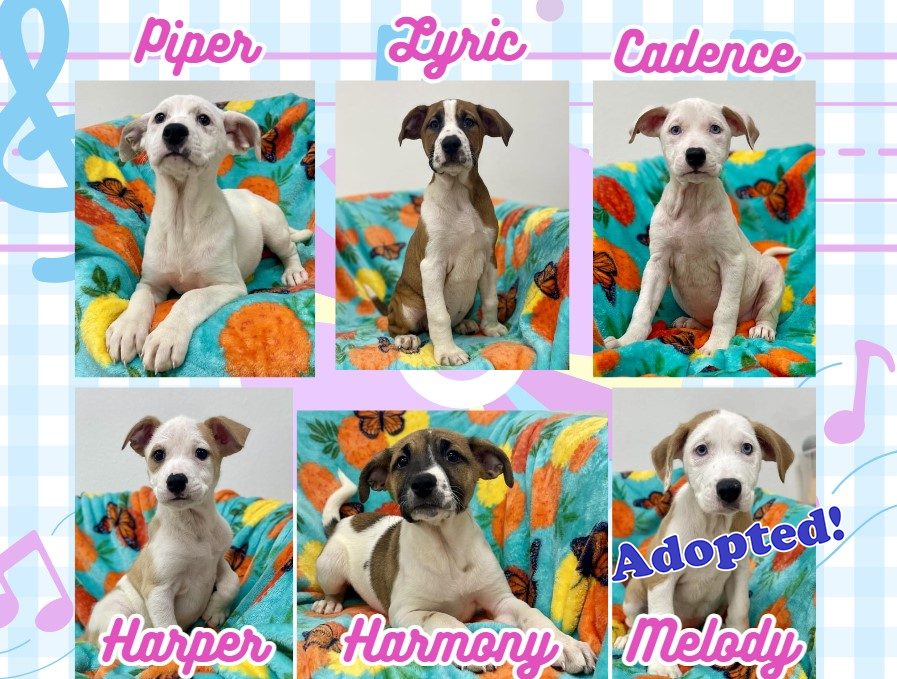 Music Litter: 3 months old, All Females, Medium-large size full grown Bring home blue-eyed Cadence, or petite-and-sweet Harper, snuggly Harmony, silly Piper, or big-and-bold Lyric. Each one is perfectly unique in both appearance and personality. This little crew of musically themed puppies are poised to strike the right chord with someone ready for a touch of puppy chaos—plus all the joy and exuberant fun of adding a young dog to their family. If that sounds like you, come down to the shelter for a meet-and-greet!